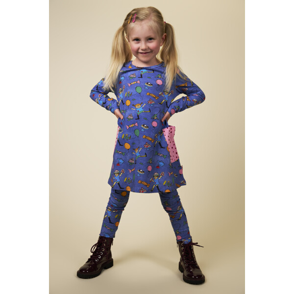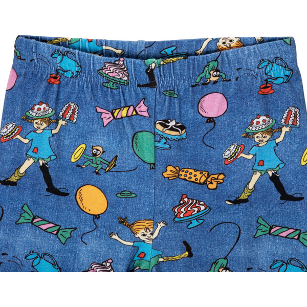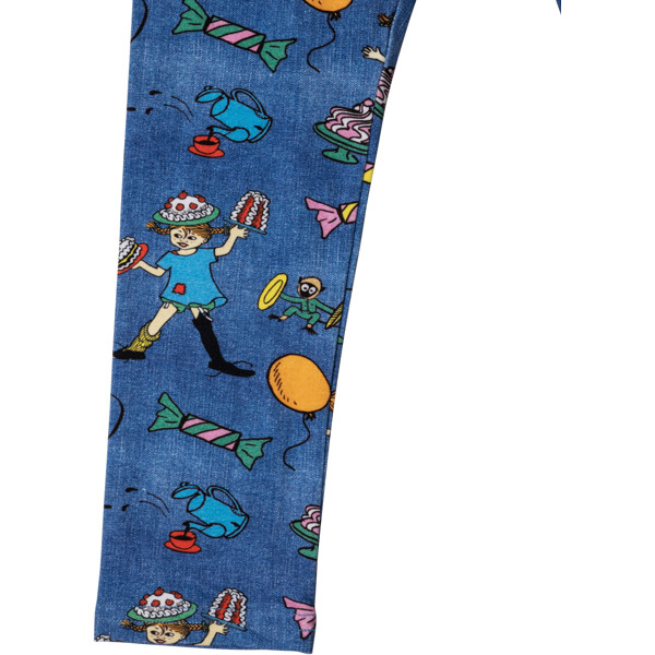 Myke og behagelige Pippi Langstrømpe-leggings for barn, med innfelt strikk i midjen. Leggingsene er herlig denimblå med festlig mønster. Produktet inneholder sertifisert økologisk bomull.