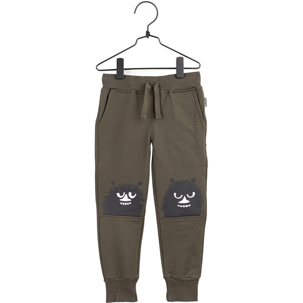 Moomin Stinky College Pants Dark Green er myke og komfortable bukser med lommer og snøring i midjen. Buksen har en nydelig grønn farge med Stinky print på begge knærne.