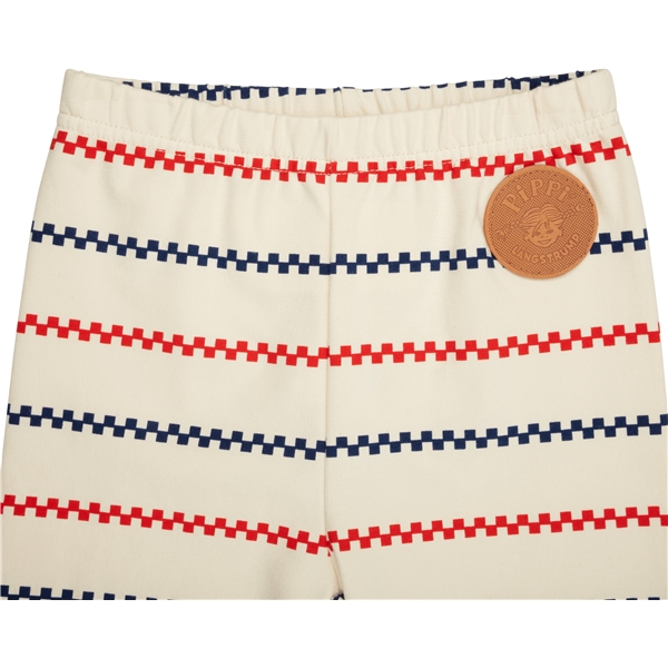 Behagelige, benhvite leggings i sweatshirtkvalitet med myk, børstet innside. Leggingsene er benhvite med Pippi Langstrømpe-rutemønster i rødt og blått. I midjen har de innfelt strikk og øverst et rundt Pippi Langstrømpe-merke i lærimitasjon. Økologisk bomullsblanding. Øko-tex.