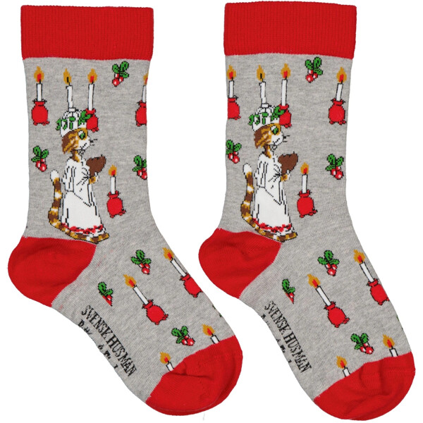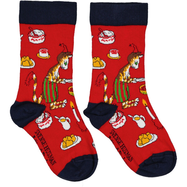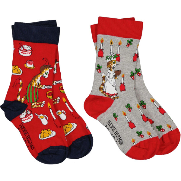 Gjør ventetiden til julaften litt morsommere med disse fargerike barnesokkene med motiv fra elskede Pettson og Findus! I denne 2-pakken får du to forskjellige mønstre – ett med Findus som spiser en masse julemat, og ett med Findus som lucia.Holder farge og form selv etter mange eventyr i vaskemaskinen.
