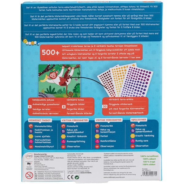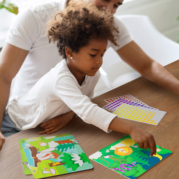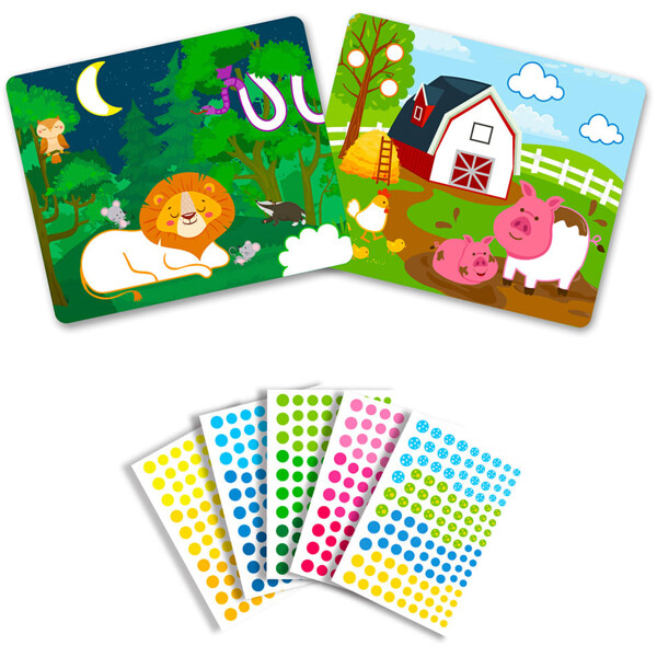 Med over 500 runde klistremerker i ulike størrelser og farger kan barnet bruke fantasien sin til å fargelegge de medfølgende bildekortene. Temaet er ville dyr, bondegårdsdyr og sjødyr. Utvikler finmotorikk, pinsettgrep, kreativ og romlig tenkning, øye-hånd koordinasjon og konsentrasjon.