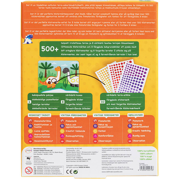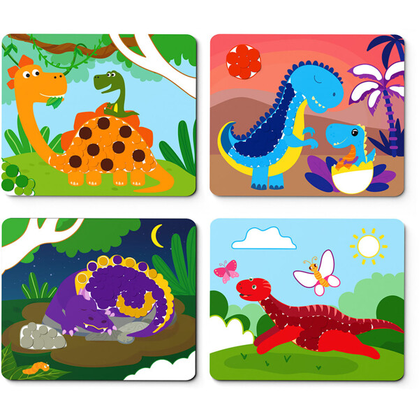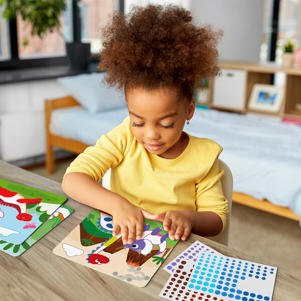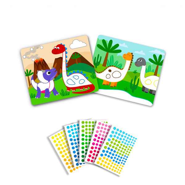 Med over 500 runde klistremerker i forskjellige størrelser og farger kan barnet bruke fantasien sin til å fargelegge de medfølgende bildekortene. Temaet er spennende dinosaurer. Utvikler finmotorikk, pinsettgrep, kreativt og romlig tenkning, øye-hånd koordinasjon og konsentrasjon.