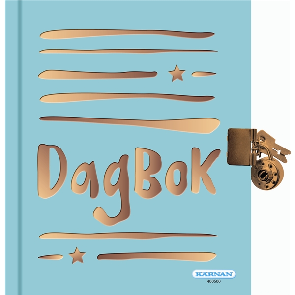 Turkis dagbok med metallic-bokstaver og lås.