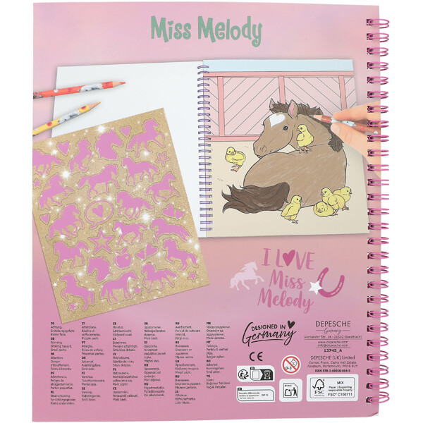 Denne fine fargeleggingsbok fra Miss Melody med spiralrygg har et stort hestemotiv og en søt katteapplikasjon med paljettedetaljer på forsiden.