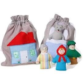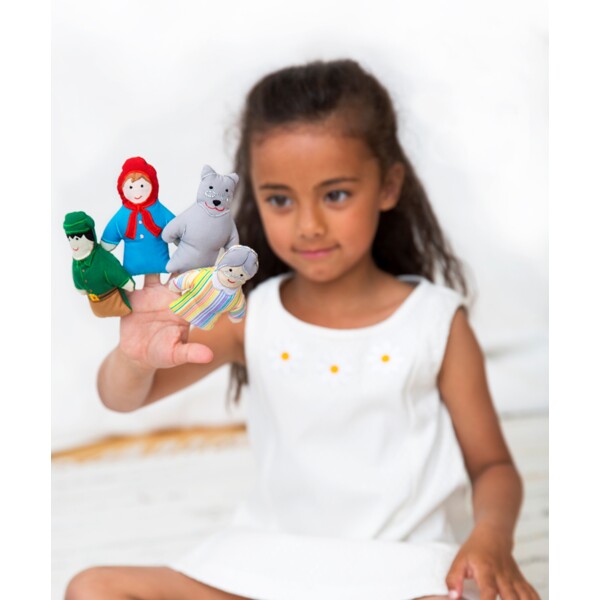 Fire fingerdokker er inkludert - Rødhette, ulv, bestemor og en jeger.