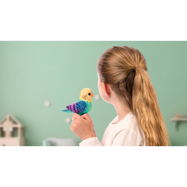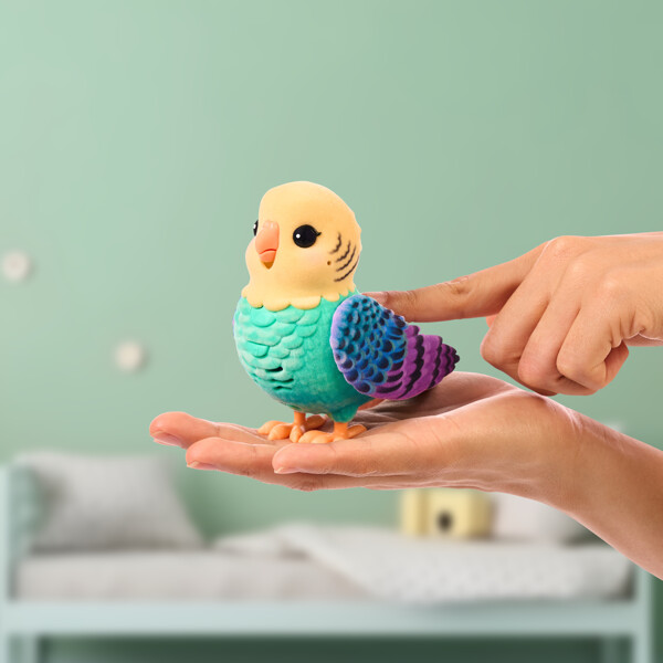Min Virkelig Virkelige Fugl ser og høres ut akkurat som en ekte fugl, med naturtro flokkede fjær, bevegelig nebb og kvitrende fuglelyder.