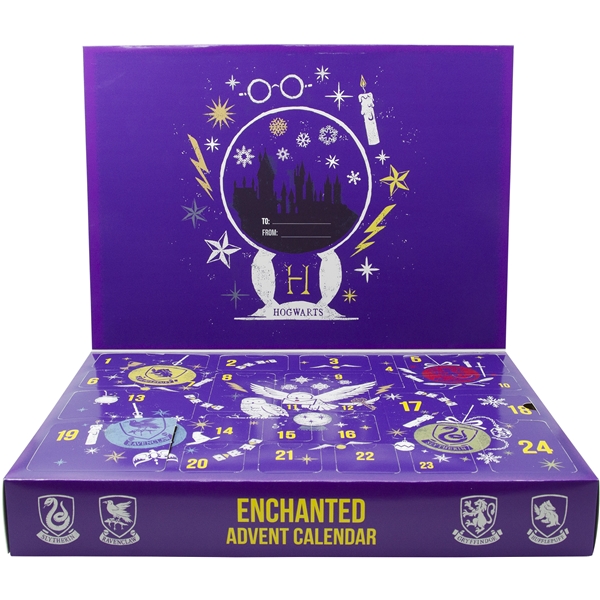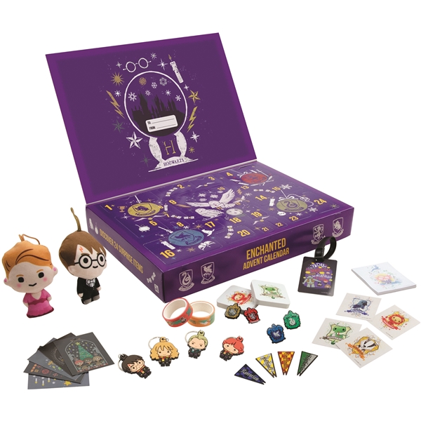 En julekalender med 24 spilleautomater, som hver inneholder en morsom overraskelse for alle Harry Potter-fans. Blant de magiske overraskelsene er det nåler, nøkkelringer, klistremerker, tape, kosedyr og mye mer.