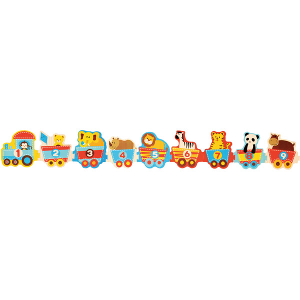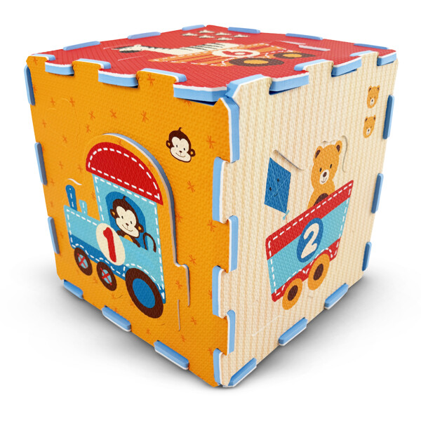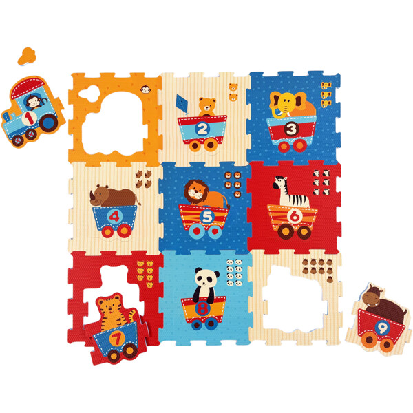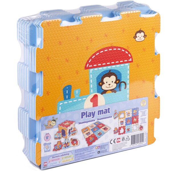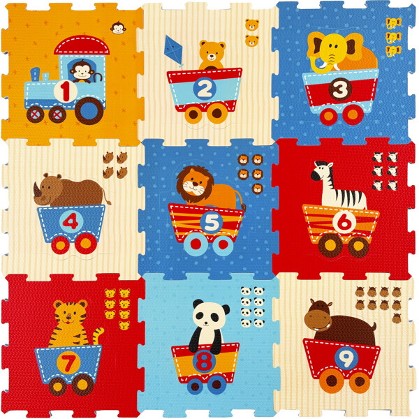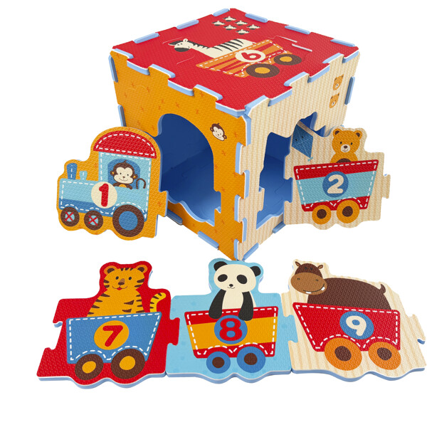 B Beez Gulvpuslespill Tall er en skumlekematte som kan pusles sammen til en matte eller til en kube. Det er også mulig å ta ut de forskjellige togbitene i hver del.