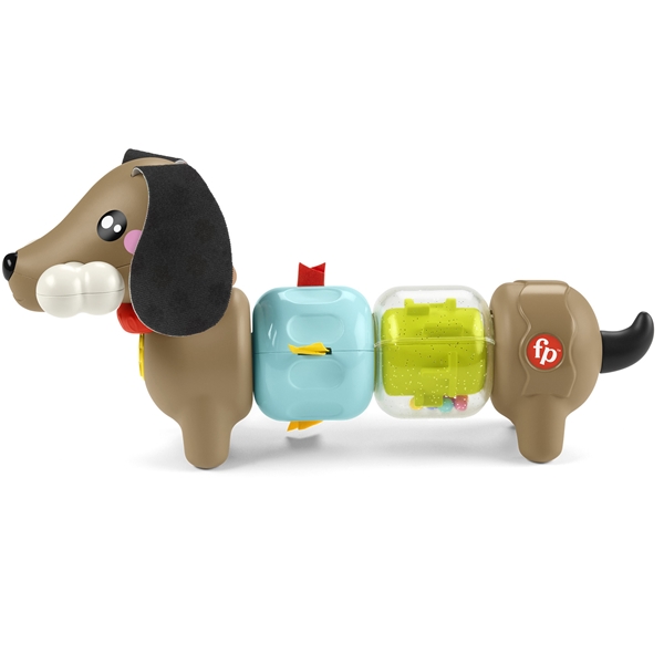 Fisher Price Click & Spin Activity Pup er det perfekte første kjæledyret for barnet! Denne søte dachshunden med sine klare farger, morsomme lyder og ulike teksturer er utformet for å stimulere barnets utvikling av syn, hørsel og berøring. Leketøyet i reisestørrelse holder barnet opptatt og hjelper samtidig til med å styrke finmotorikken.