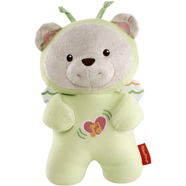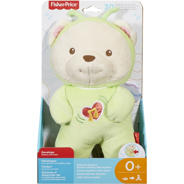 Fisher Price Sovedyr med Lyd - Butterfly Dreams av Fisher Price hjelper ditt barn å roe seg ned og sove og Fisher oppdager nye flater og lyd. Den myke plysjflaten er svært komfortabel å bevege og de myke satengvingene kan enkelt gripes av alle barn. Trykk bare ned på magen og teddyen begynner stille spille en blanding av rolig musikk, surrende lyd, rytmer som minner om hjerteslag, naturens lyd eller hvitt brus. Ditt barn kommer til å føle seg trygt og bekvemt, som om det var igjen i mors mage. Eller du kan bruke 10 minutters trivelige vibrasjoner og myk lyd for å få babyen til å rose seg. For en deilig søvnMyk plysj med kosedyr med satengvingerOpp til 30 minutter av en blanding av rolig musikk, lyd og lysTrivelige vibrasjoner som hjelper ditt barn å sovneSikker bearbeiding gjør den passende for de minste barneneDen fungerer på 2 x AA-batterierVakkert design- Krever 2 x AA batterier (inngår=