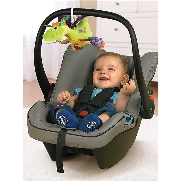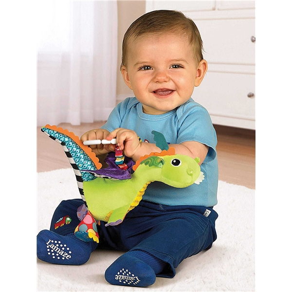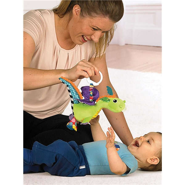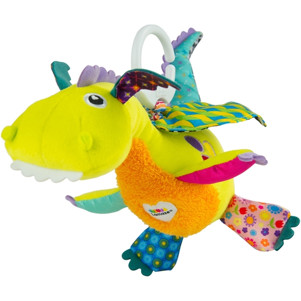 Lamaze Flip Flap Dragon er et morsomt aktivitetsleketøy. Barnet vil elske å se dragen flagre med vingene. Trekk i den hvite klemmen for å få de livlige vingene til å snu og klappe frem og tilbake. Barnet kan også legge merke til de rynkete føttene og nesen som piper. Med myke stoffer i en rekke kontrastfarger med seks forskjellige materialer kan barnet ditt utforske og utvikle sansene sine. Med den praktiske klipsen kan du hekte dragen i barnevogner, bæreseler og bleieposer for å ta ham med på farten.