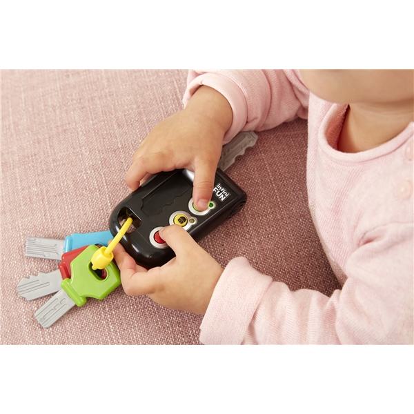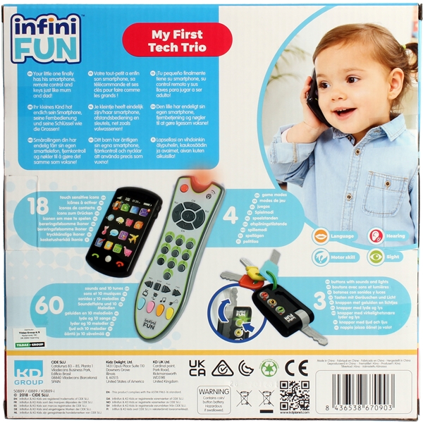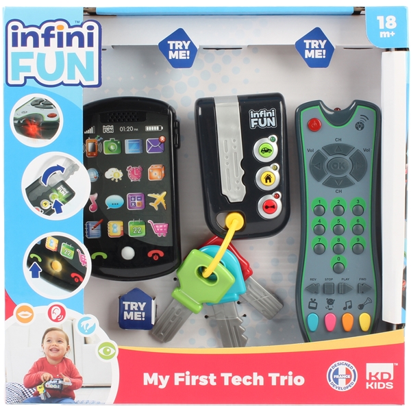Tech Trio fra Infinifun gir barnet sitt eget sett med dingser - akkurat som mamma eller pappa har! Den elektroniske nøkkelen har flere spennende knapper å trykke for å høre morsomme setninger, realistiske lyder, farger og lyseffekter. Fjernkontrollen har 4 forskjellige moduser og kan spille forskjellige lyder og lys. Den har 24 gummiknapper og i forskjellige former, akkurat som en ekte fjernkontroll. For å kunne ringe eller sende en tekstmelding til kjære, kreves det en telefon, her kan barna imitere de voksne ved å spille forskjellige ringetoner. Liksomappene på telefonen har flere lyder og lyseffekter for å forbedre spillopplevelsen for barnet.