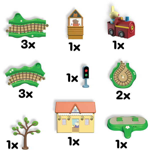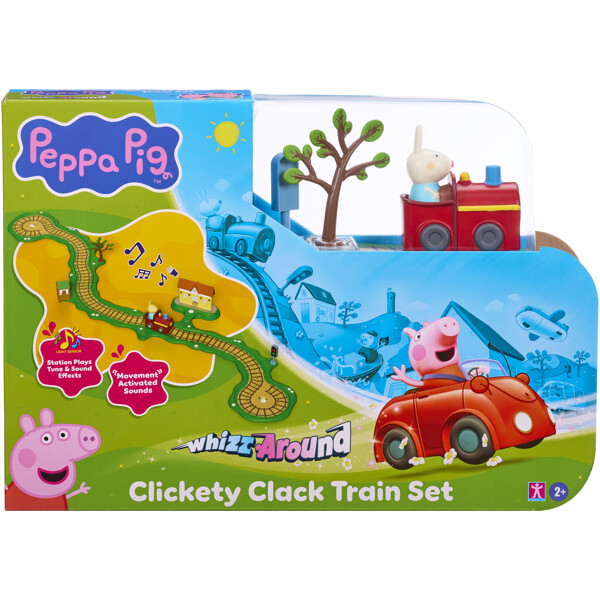 Peppa Pig Whizz-Around er en vakkert detaljert og fargerik serie av spor- og kjøretøyleker som bringer Peppa Pigs verden til live på en helt ny måte!Peppa Pig Whizz-Around Clickety Clack Togsett inneholder Rebecka Kanins Lille Røde Tog, sammen med togspor, tilbehør og Togstasjon med bevegelsesstyrte lydeffekter! Sporene kobles sammen med et enkelt puslesystem som er perfekt for små hender å sette sammen. Tilpass sporet med tilbehør. Trykk deretter på knappen på toget og se Rebecka kjøre! Når toget passerer stasjonen, hører du melodier, fraser og lydeffekter!Peppa Pig Whizz-Around er perfekt for å oppmuntre til fantasifull lek og utvikle finmotorikk og hånd-øye-koordinasjon. Bygg din egen Peppa Whizz-Around-verden og skap morsomme eventyr for Peppa og vennene hennes.Inneholder:6 x Togspor2 x Togsporsvinger1 x Rebecka Kanins Lille Tog1 x Herr Bulls Signalhus1 x Togtrafikklys1 x Tre1 x Togstasjon1 x Elektronisk base4 x AAA-batterier kreves (ikke inkludert).