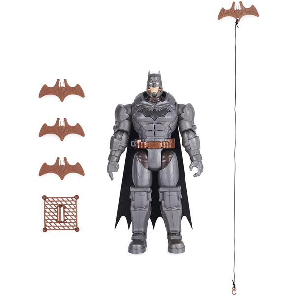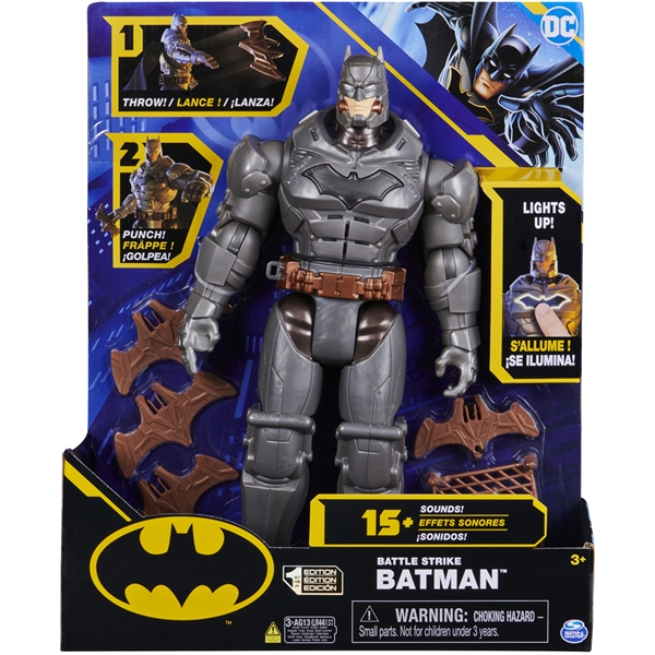 Lag dine egne Batman-eventyr med DC Comics Battle Strike Batman. Denne actionfiguren på 30 cm har full rustning, detaljert konstruksjon, serielignende detaljer og tilbehør som vekker dine favoritt Batman-figurer til live. Arm Batman med bataranger, et nett eller et drag. Inkluderer 5 vedlegg, slik at du kan fortsette å legge dem inn i Batmans hender, trekke bena bakover og skyte mot superskurker. Batman kan også kaste et slag hvis han ikke har noe i hånden. Ekte kastehandling slik at du kan bekjempe kriminalitet og beskytte Gotham City. Trykk på Batmans bryst for å aktivere over 15 forskjellige lyder. Batman- og DC-fans i alle aldre vil elske Batman Action Figurer som setter fantasien deres i sving og hjelper dem å skape sine egne episke superheltkamper. Gjør deg klar for episk action med Battle Strike Batman-actionfiguren.