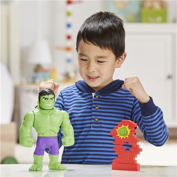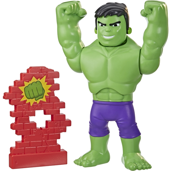Denne 25 cm høye actionfiguren for barn er klar for alle Super Hero-eventyr. Når barnet trykker ned på Hulkens hode, snur hodet for å endre uttrykket hans fra glad til kraftig, slik at barn kan forestille seg at han lader for handling! Trykk ned på Hulk-figurens hode for å heve og senke armene for å knuse det medfølgende todelte veggtilbehøret.