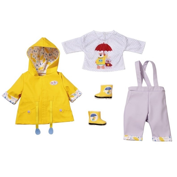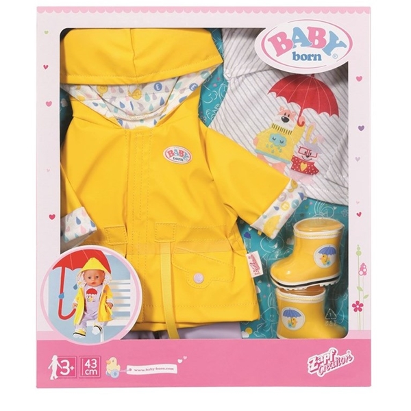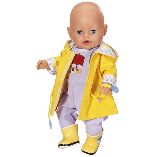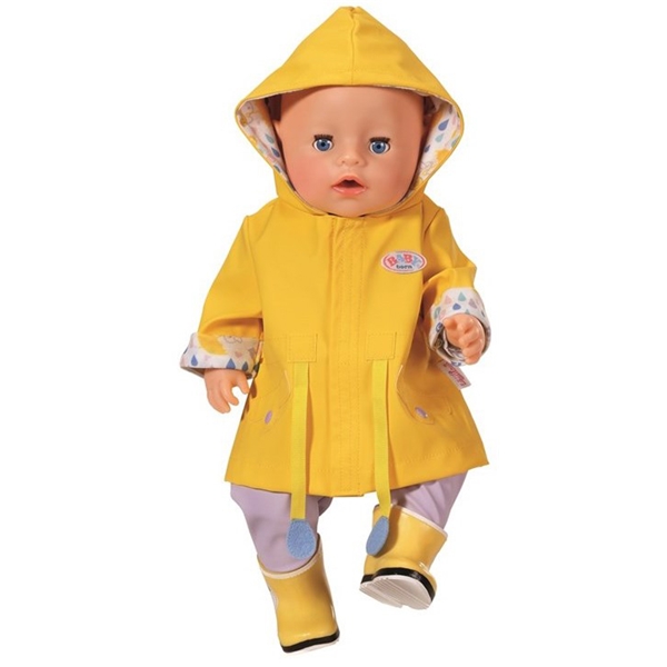 BABY Born Deluxe regnutstyrt 43 cm er perfekt å ha de dagene regnet bare strømmer ned. BABY born elsker å være ute og leke i regnet, og med de gule gummistøvlene hopper hun fra pytt til pyt og stikker ut tungen for å fange vanndråpene. Gummistøvlene hennes sammen med den gule regnjakken med hette og lilla vanntette bukser. Under regnutstyret har hun en hvit langermet genser med lilla bånd og bjørnen Bruno og kaninen Benno under paraplyen.