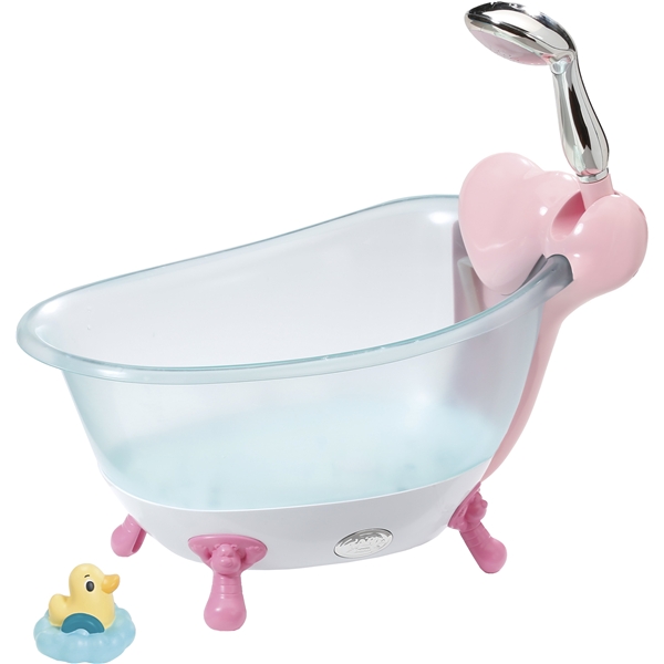 Barn elsker å leke med vann og bade dukkene sine. Baby Born badekaret har to pumper.. Fra den ene kommer vann, og fra den andre en herlig såpeskum. Badekaret har beslysning i bunnen, som gir et herlig skinn når badekaret er fullt med skum. Badekaret har dessuten lysfunksjoner slik at Baby Born dukkene har det så bra at de nesten ikke vil opp fra badet. Inkluderer batterier.