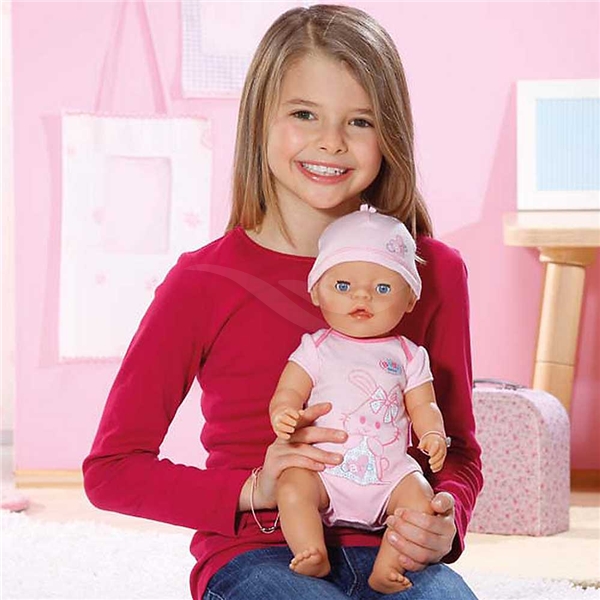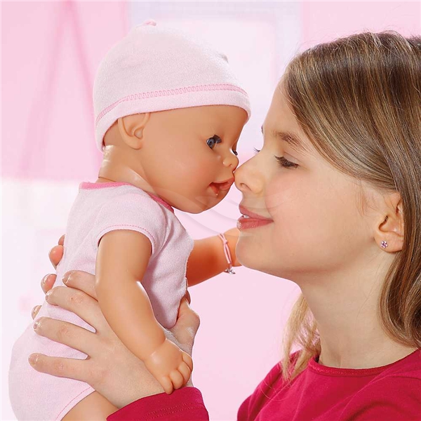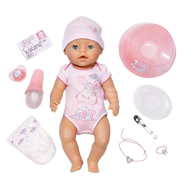 Denne interaktive jentedukken har bevegelige armer, bein og hode samt mange realistiske funksjoner. Den gråter ""riktige"" tårer, drikker av sin flaske, spiser sin mat og tisser i bleien. Du kan også bade dukken og bruke alt tilbehør for å stelle dukken som om det var en riktig baby. En databrikke inni dukken aktiverer spesielle batteridrevne tilbehør med lys- og lydeffekter!