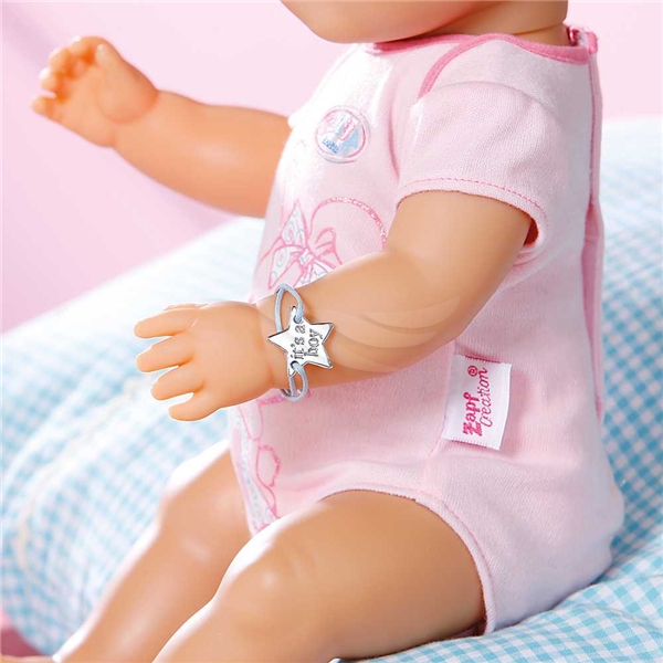 Inklusive 1 jentedukke, 1 body, 1 lue, 1 flaske med kork, 1 potte, 1 smokk, 1 tallerken, 1 skje, 1 bleie, poser med barnemat, 1 hjerteformet armbånd samt id- og fødselssertifikat med personlig tilgangskode til Baby Borns verden på nett. 43 cm. Fra 3 år.