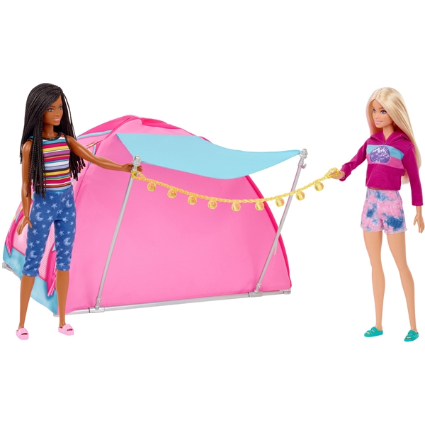 Kom deg utendørs med dette Barbie-lekesettet med Barbie "Malibu" og "Brooklyn"-dukker, deres eget telt og tonnevis av tilbehør! Det ekstra store campingteltet i stoff har plass til fire dukker og er dekorert med markise og lys. Barna kan bygge campingplassen sin og leke i den stjerneklare natten med sammenleggbare stoler, et teleskop, en bålplass, marshmallows, et kortspill og mer. Kanskje til og med noen dyr fra skogen kommer på besøk?