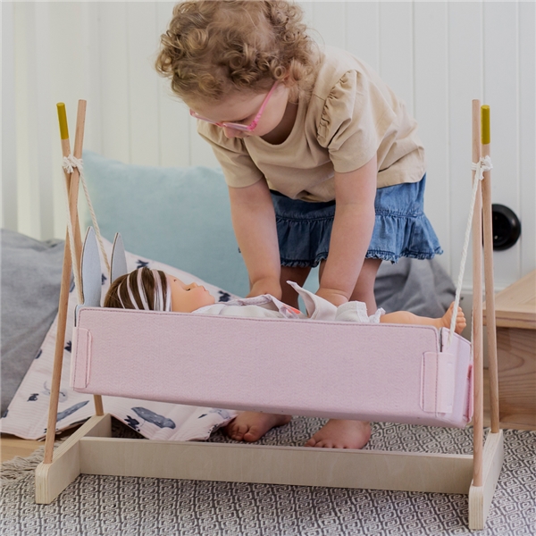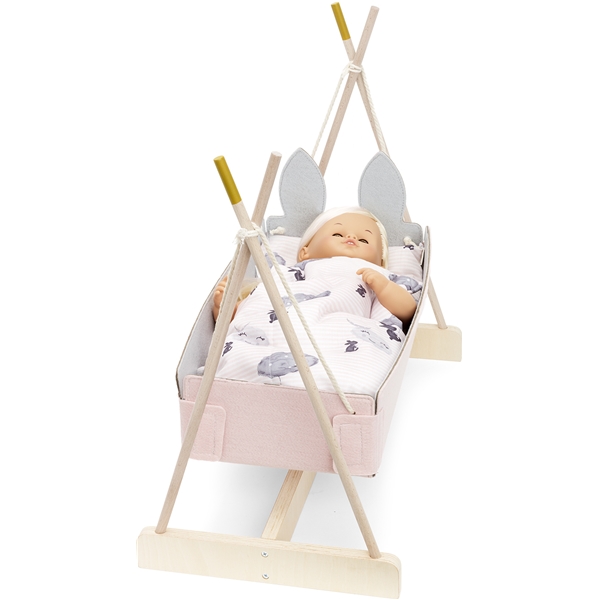 Skrållan Dukkevugge er en søt vugge som gir favorittdukken sin helt egen soveplass. Dukken gynges stille og fredelig for å sove, og forhåpentligvis sover hun gjennom natten uten å våkne en eneste gang. Dukkeholderen er laget av myk filt og har søte kaninører. Den har plass til dukker som er opptil 45 cm.