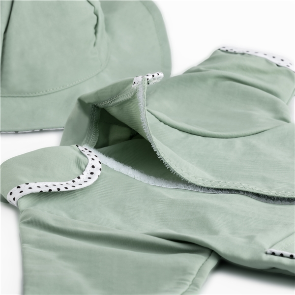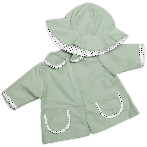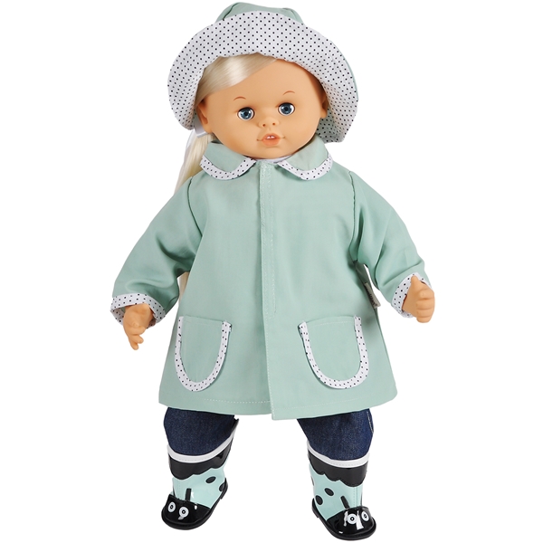 Ta med Skrållan ut på gåtur i regnet! Med denne regnjaken og regnhatten holder hun seg tørr når regnet øser ned. Dukkeklærne er laget av vannavvisende tøy i pen farge og hvitt fór med sorte små prikker. Fint og praktisk så dere alltid kan være ute sammen, uansett vær. Regnklærne er av høy kvalitet, og passer perfekt til snakkedukken. Det finnes også matchende tøffe støvler til denne jakken. Passer til dukker på 45 cm.