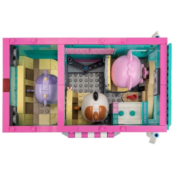 Lek med eller vis frem de medfølgende byggbare Squishmallows-figurene Cam, Bubba og Brina, når de sitter i ett av de fire bilsetene i vanen, danser til musikken i baksetet eller vinker til fans fra siden eller gjennom den åpne døren.
