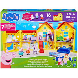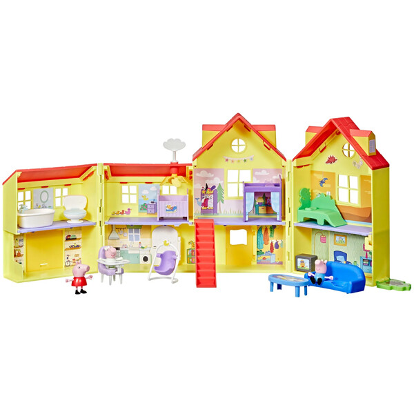 Med dette engasjerende lekesettet kan barn utforske Peppa Pigs store familiehus, som åpnes opp for å avsløre en romslig 80 cm (2,5') bred lekeplass. Med 2 etasjer og 7 rom kan barna oppdage Peppa, George og Baby Evies soverom, bad, stue, kjøkken og garasje. Settet inneholder 11 tilbehør, f.eks. senger, en sklie og et toalett, samt et klistremerkeark for ekstra tilpasning.