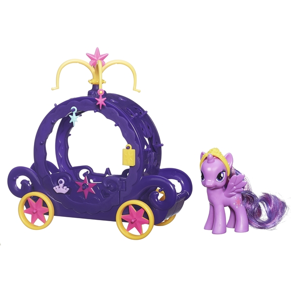 My Litle Pony Charm Carriage er et søtt lekesett med Princess Twilight Sparkle og hennes vakre vogn. Med dette MY LITTLE PONY-lekesettet kan Twilight Sparkle reise rundt og hilse på vennene sine som en ekte prinsesse. Du kan til og med dekorere den vakre vognen med spesielle smykker som forestiller skjønnhetsmerker som speiler Twilight Sparkles unike personlighet.I My Litle Pony Charm Carriage settet inngår 1 stk Twilight Sparkle-ponny, 1 stk vogn og 4 stk smykker (amuletter).
