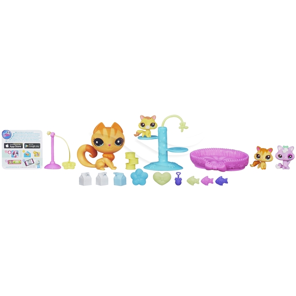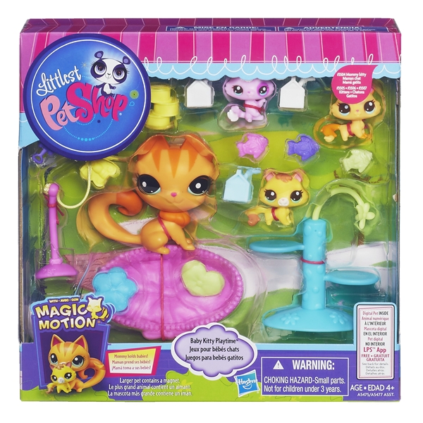 Littlest Pet Shop Baby Kitty Playtime er et fantastisk fint sett med en kattemamma og hennes søte kattunger! Det er tid for å leke med kattungene og mamma har de beste lekene! Når kattungene er trette kan mamma løfte dem og legge dem i sengene deres for at de skal ta en lur! Med kattemamma, tre kattunger, tn kloretre, en søt seng, melkekartonger, 3 lekefisker og mye mer!