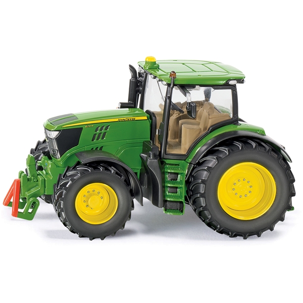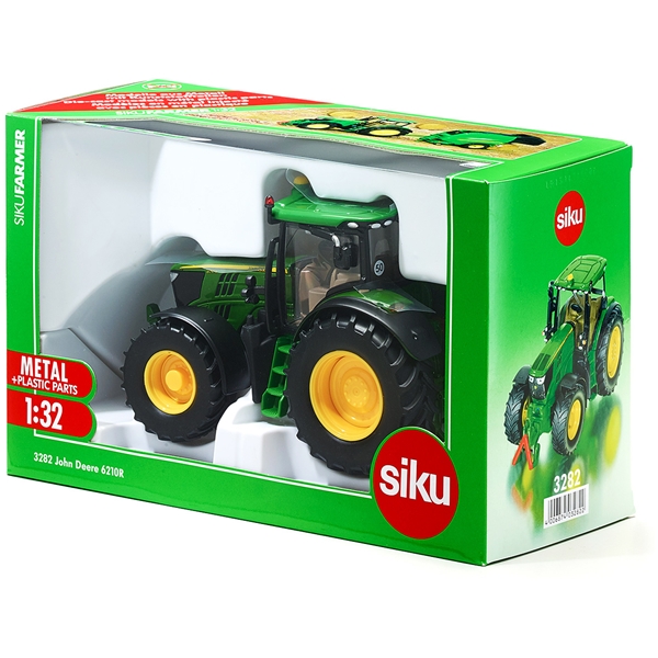 John Deere 6210R traktor. Denne store traktoren har funksjoner som dobbeltakselstyring, clutcher, to roterende, blinkende lys på taket og speil som kan foldes inn. Førerhuset har glassider og kan fjernes.