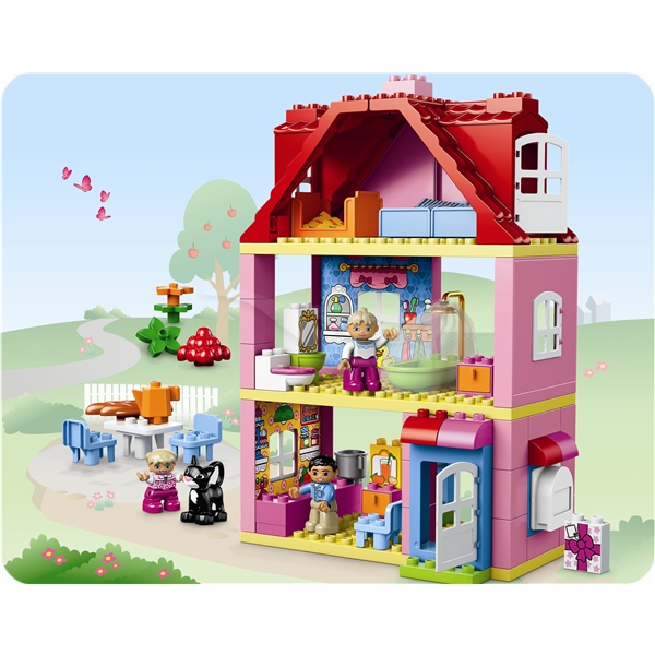 Bygg et drømmehus i tre etasjer med tre LEGO® DUPLO® figurer og en katt! Et drømmehus laget spesielt for jenter, med et detaljrikt kjøkken, bad og et koselig soverom med egen balkong. Kan bygges om til mange forskjellige versjoner med massevis av tilbehør til hvert rom! Puss opp rommene med tapet som kan skiftes ut!.10505 LEGO Duplo Lekestue inneholder tre LEGO® DUPLO® figurer: mor, far og datter Inkluderer lekestue i tre etasjer, med kjøkken, bad, kvistværelse og utskiftbar tapet Kjøkkenet har dør som kan åpnes, skuffer og skap, brød, frukt, kjele og kaffekanne Bad med badekar og dusjforheng, do, vask og kommode Bad med balkongdører og tre senger med soveposer til bruk ved pyjamasfest Tilbehør inkluderer bord, tre stoler, postkasse, dekorerte klosser og en katt Puss opp med tre versjoner av Klikk & skift-tapet! Inneholder rosa veggelementer Bygg om og puss opp i mange forskjellige stiler! DUPLO produkter er morsomme og trygge for små barn 40 cm høyt, 26 cm bredt og 15 cm dypt