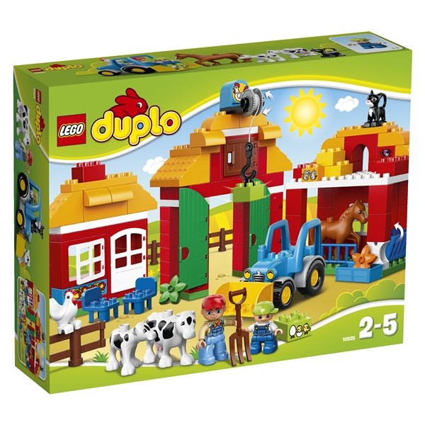 Dette store bondegårdssettet med byggbare modeller har alt du og barnet ditt trenger for å oppleve gårdslivet! Det inneholder en låve for oppbevaring av fôr, et gårdshus med stoler og en stall til hesten. Kuene spiser og koser seg, mens traktoren står klar til arbeid ute på åkrene. Dette settet byr på timevis med rollespill Inneholder to LEGO DUPLO figurer: en bonde og et barn.