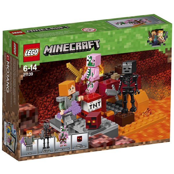 21139 LEGO Minecraft Striden Nether – Sett vei mot deg flammende Nether, aktiver eksplosjonsfunksjonen med TNT og bruk din fortrollede øk for å beseire zombie pigman og witherskjelettet. Vær med på et ekte Minecraft™ eventyr i dette Lego® Minecraft settet – laget for fans av det populære dataspillet. Kombiner settet med andre LEGO Minecraft modeller for å lage ditt eget unike LEGO Minecraft univers. Inneholder også LEGO Minecraft minifiguren Alex.