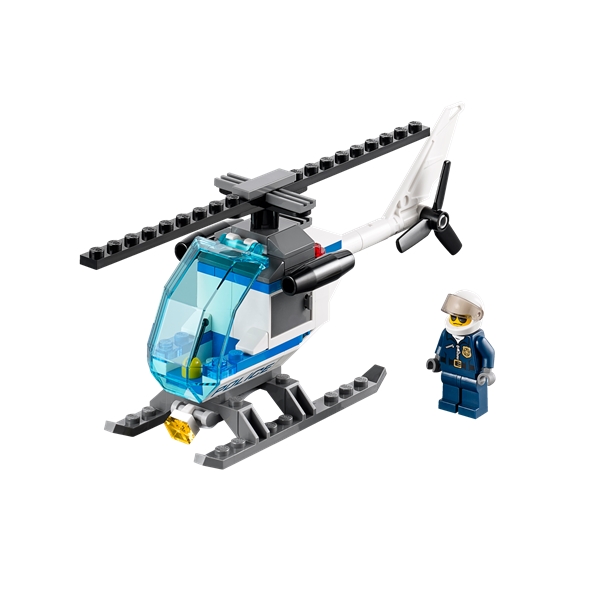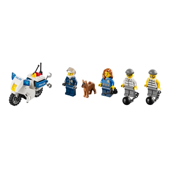 Alarmen går på politistasjonen! Tauebilen er brukt til å rive fengselsvinduet rett ut av veggen, og fangen er i ferd med å rømme! En av de andre fangene rømmer gjennom takluken, mens en tredje har gravd seg en rømningstunnel fra doen! Tiden er knapp! Bruk politihelikopteret for å se etter rømlingene fra luften. Ta opp jakten på dem med politibil og motorsykkel – skynd deg før de forsvinner for godt! Inneholder syv minifigurer med diverse tilbehør: tre politimenn, en politikvinne og tre skurker.