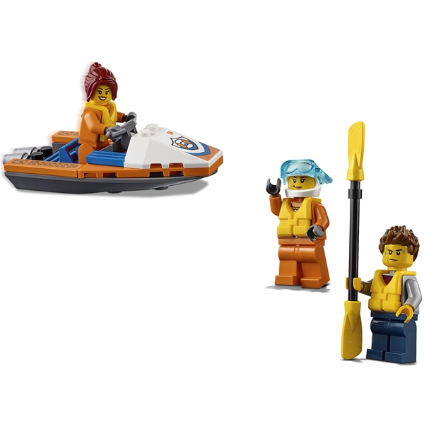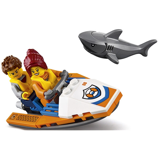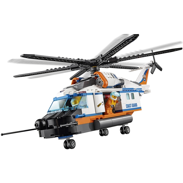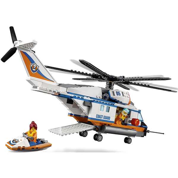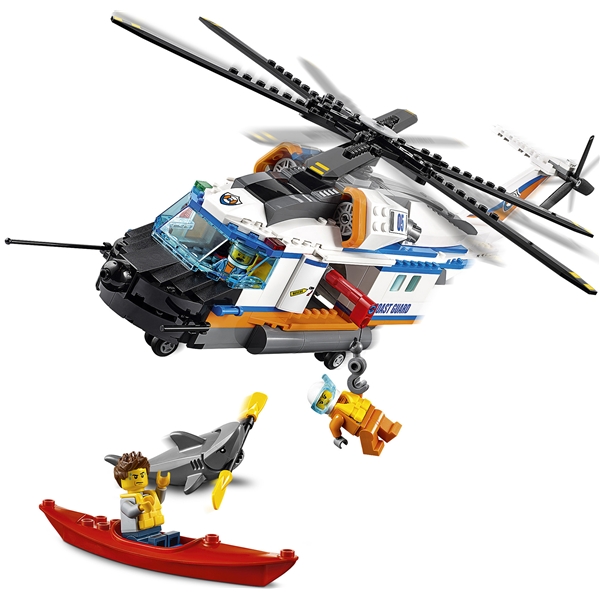 Bli en av de modige LEGO® City kystovervåkerne i det tunge redningshelikopteret med skyvedører på sidene, åpningsbar rampe bak med plass til den medfølgende vannscoteren, cockpit for to minifigurene, og roterende kranearm med senkbar vinsj.Dette morsomme settet inneholder også et fyr, et skipsvrak, og en kajakk med padleåre samt fire minifigurer: en kvinnlig og to mannlige kystovervåkere samt en kajakpaddler og en hai.