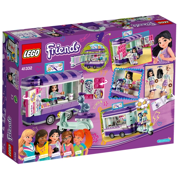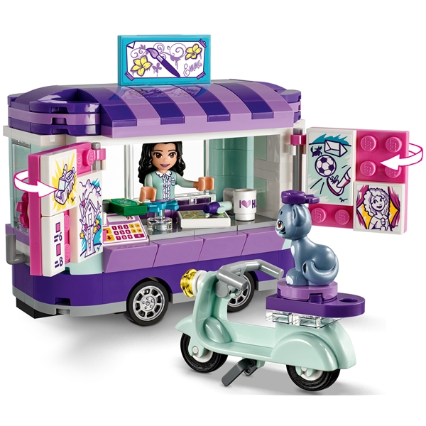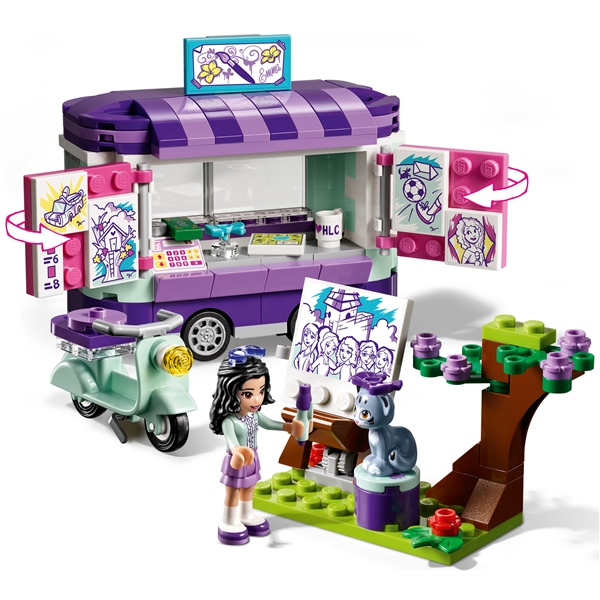 Bruk scooteren for å dra LEGO® Friends Emmas kunststativ hvor du vil med dette kule leketøyet. Med doble vinduer som kan åpnes til en salgsluke, forskjellige kunstverksbrikker, kasseapparat, kart over parken i Heartlake City og en seng til Emmas katt. Løft av taket eller åpne hele baksiden på tilhengeren slik at det er lett å leke innvendig. Inneholder også et separat stativ med en pall ved siden av et tre. Inneholder en minidukke og en kattefigur.