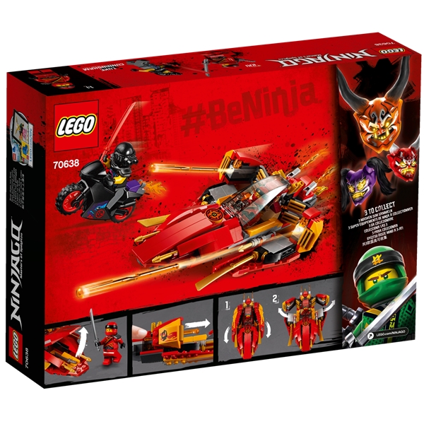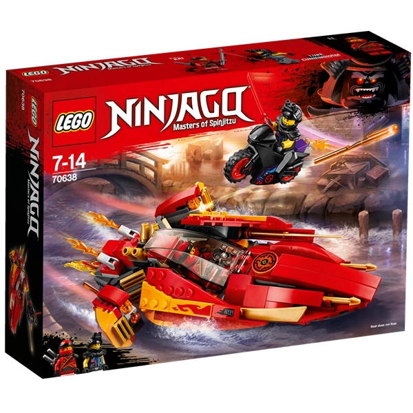 70638 LEGO Ninjago Katana V11 – Iscensett en høyhastighetsjakt på land og til havs med dette actionfylte LEGO® NINJAGO® settet, som inneholder Kais båt Katana V11 med jakt- og angrepsmodus, utfellbare turbomotorer og kanoner med fjærmekanisme. Denne stilige leken inneholder også Luke Cunninghams streetmotorsykkel, pluss 2 minifigurer med våpen for actionfylte rolleleker.