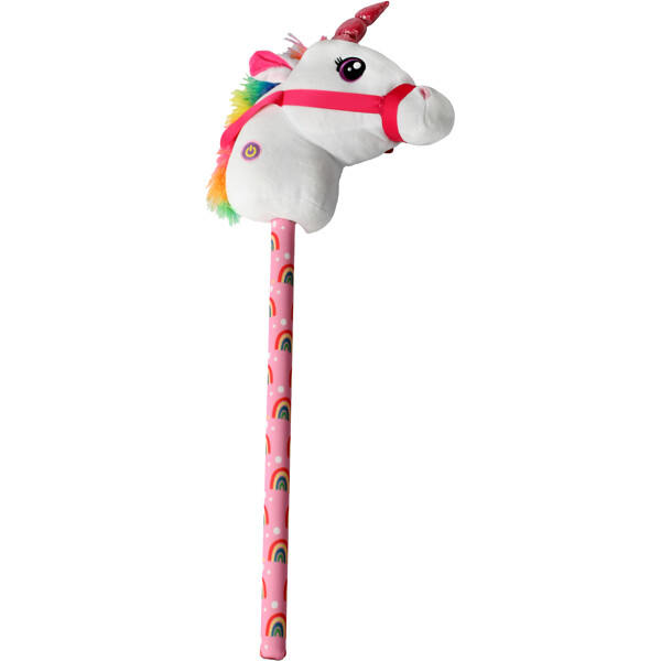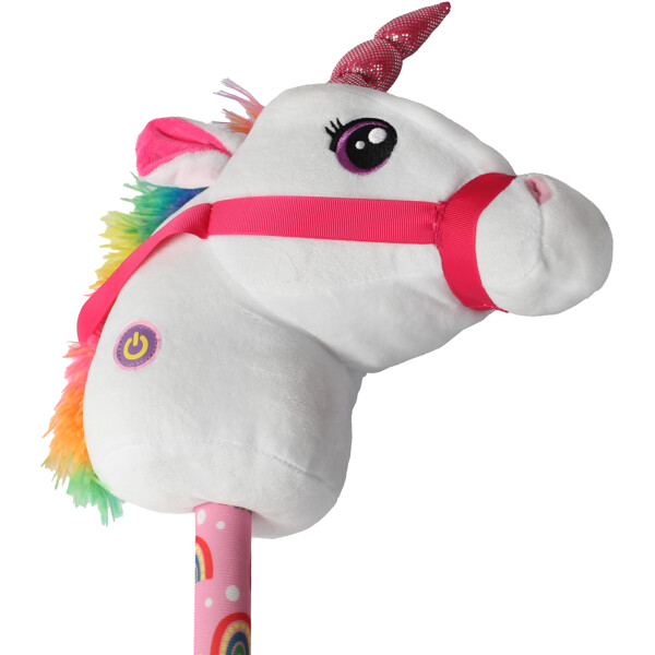 Happy Pets Kjepphest Enhjørning er en søt enhjørning med en rosa man og et glitrende horn i pannen. Hopp på kjepphesten og ta en tur gjennom huset eller bygg en hinderløype i hagen og ri gjennom den. Trykk på knappen for å høre hestens hover klappe mot bakken.