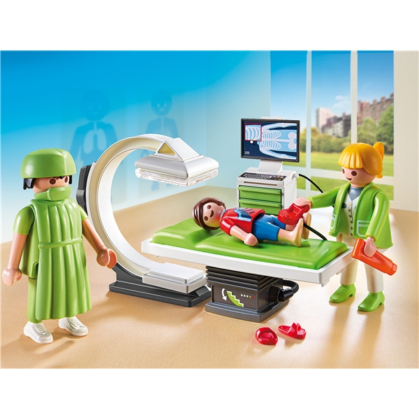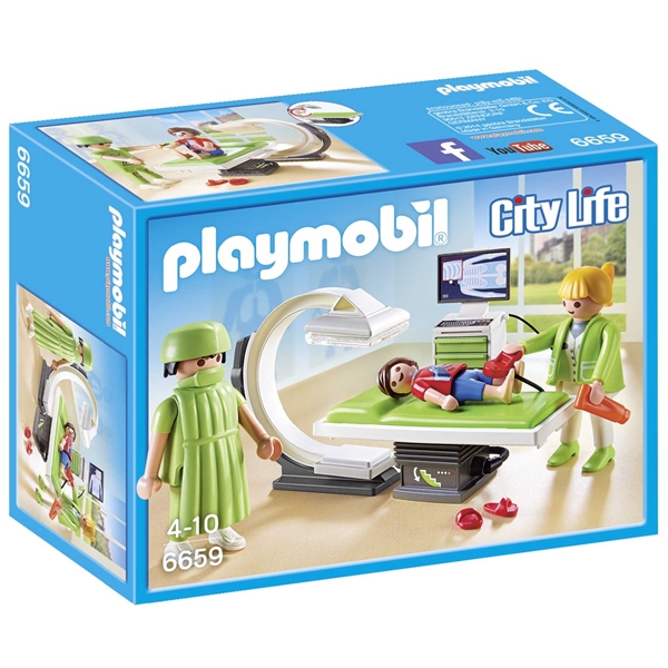 I 6659 Playmobil Røntgenrom kan du undersøke hva som har skjedd med pasienten ved hjelp av røntgenapparatet og andre medfølgende instrument. Ikke glem å sette på verneklærne på legene! Inneholder to legefigurer og en pasient.
