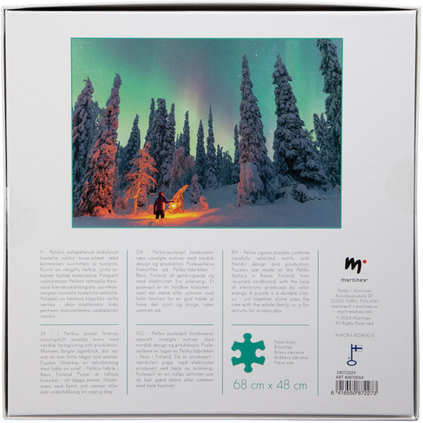 Puslespillet er laget av resirkulert kartong og det ferdige puslespillets størrelse er 68 x 48 cm.