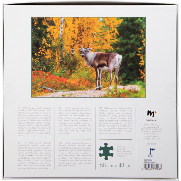 Puslespillet er laget av resirkulert kartong og det ferdige puslespillets størrelse er 68 x 48 cm.