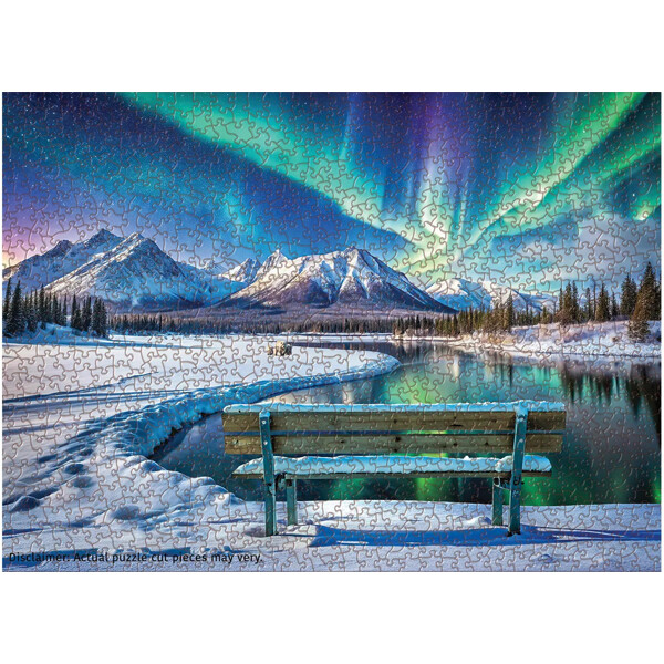 Ta en plass på første rad for å se nordlyset. Grønne og fiolette bånd sveiper over en stjerneklar Yukon-himmel over snødekte topper og en speilblank elv, med en frostet benk som inviterer deg til å bli værende. Klare soner – nordlysbånd, natthimmel, fjell, skoggrense, iskaldt vann og trestruktur – skaper et vakkert motiv.