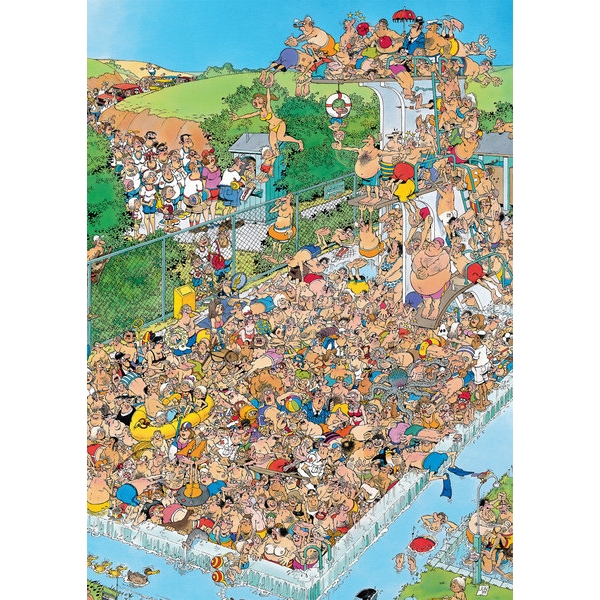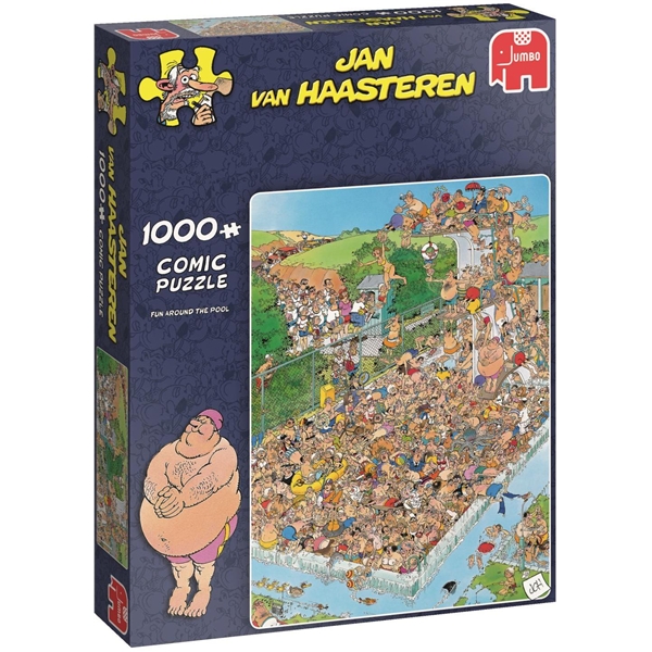 Puslespill 1000 Biter - Fun Around the Pool er et limited edition puslespill fra Jumbo med et morsomt motiv av Jan Van Haasteren. Fun Around the Pool har et morsomt og veldig detaljert motiv som forestiller et litt kaotisk og veldig populært basseng. Dette er et limited edition puslespill noe som betyr at motivet finnes under en begrenset periode og når det er slutt kan det ikke å kjøpes på nytt.Jan Van Haasteren er en hollandsk illustratør som er kjent for å lage utrolig detaljerte, fargerike og humoristiske illustrasjoner, eksklusive for Jumbo. De fleste av Jans fans leter med en gang etter hans kjennetegn – en haifinne, som finnes med på alle hans puslespill. Noe annet man ofte ser i hans illustrasjoner er et selvportrett av Jan. Kan du finne det på ditt nye puslespill?