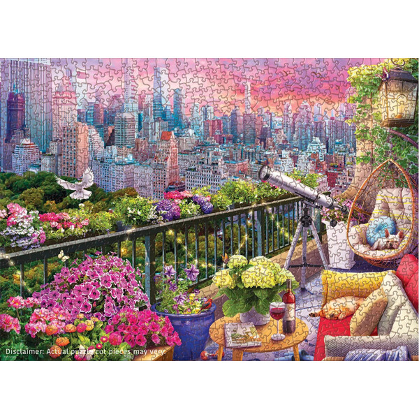 Slapp av på et frodig tak i New York hvor blomsterkasser flommer over, lysslynger gløder og et teleskop peker mot en pastellrosa silhuett over Central Park. Med tydelige soner – solnedgangshimmel, skyskrapere, trær, rekkverk, blomster, teleskop og koselige sitteplasser – er dette et velvære-motiv.
