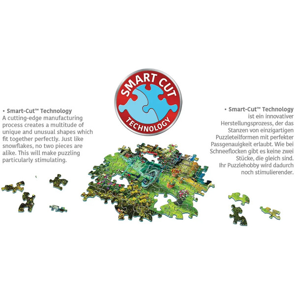 Smart-cut: Denne banebrytende produksjonsprosessen skaper en mengde unike og uvanlige former som passer perfekt sammen. Akkurat som snøfnugg er ingen to biter like. Dette gjør puslespillleggingen spesielt utfordrende og stimulerende.