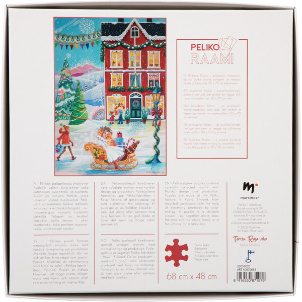 Inneholder Peliko Raami, en puslespillmonteringsplate som gjør det lett å pusle og ramme inn puslespillet i en ramme i standardstørrelse 50 x 70 cm.