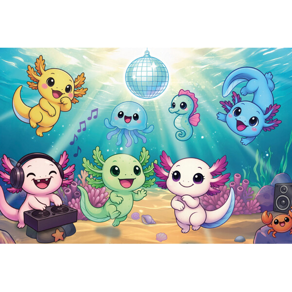 Puslespill 100 Biter Axolotl er et fint motiv med dansende Axolotler på havets bunn.