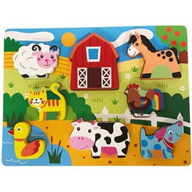 Glade bilder og sterke farger gjør puslespillbyggeren glad og utvikler samtidig barnets oppfatning og fingerferdighet. Barnet kan også leke med disse slitesterke puslespillbrikkene. Temaet for puslespillet er husdyr.