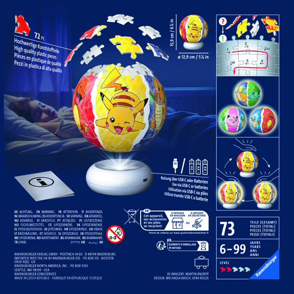 Puzzle 3D Pokémon Night Light 72-brikker er et morsomt puslespill som, når det er fullført, kan brukes som nattlys med lydaktivert lys!